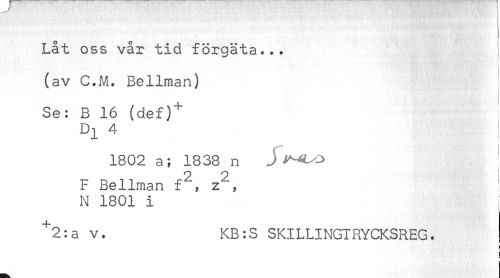 //// Låt oss vår tid förgäta... //// ^ //// (av C.M. Bellman) //// Se: B 16 (def)^ //// D^ 4 //// 1802 a; 1838 n j //// 2 2 i //// F Bellman f , z , //// N 1801 i ^ ////