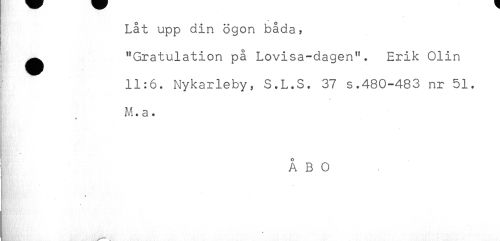 //// ! Låt upp din ögon båda? //// C . ' ' ' //// ^ "Gratulation på Lovisa-dagen". Erik Olin //// 11:6. Nykarleby, S.L.S. 37 s.480-483 nr 51. //// M. a. //// ÅBO //// ,-, ////