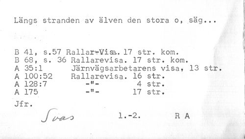 //// * //// ' ' ' ' i //// B 41, s.57 Rallar-Vis^.17 str. kom. //// B 68, s. 36 Rallarevisa. 17 str. kom. //// A 35:1 Järnvägsarbetarens visa, 13 str. //// A 100:52 Rallarevisa. 16 str. //// A 128:7 4 str. //// A 175 17 str. //// Jfr. //// 1.-2. RA ////