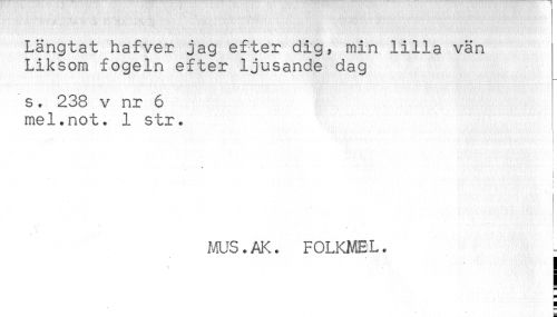 //// Längtat hafver jag efter dig, min lilla vän //// Liksom fogeln efter ljusande dag //// s. 238 v nr 6 //// mel.not. 1 str. //// i //// t //// i //// H ////