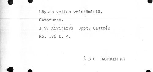 //// Löysin veikon veistämistä, //// Sotarunoa. //// . //// t //// 1:9, Kivijärvi Uppt. Castren //// R5, 176 b, 4. //// ! //// ÅBO RANCKEN MS ////