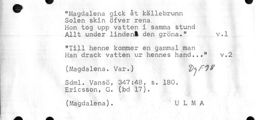 //// ^^ "Magdalena gick åt källebrunn //// Solen skin öfver rena. //// Hon tog upp vatten i samma stund //// Allt under lindenA den gröna." v.l //// "Till henne kommer en gammal man //// Han drack vatten ur hennes hand..." v.2 //// t .'. . , , * //// (Magdalena. Var.) ^^^ //// Sdml. Vansö, 347:48, s. 180. //// Ericsson, G. (bd 17). //// (Magdalena). U L M A ////