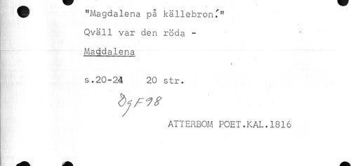 //// w "Magdalena på källebronf" //// - //// Qväll var den röda - //// Maddalena //// s.20-24 20 str. //// AITERBOM POEI.KAL.1816 ////