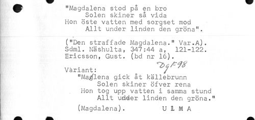 //// ^^ "Magdalena stod pa en bro //// Solen skiner så vida //// Hon öste vatten med sorgset mod //// Allt under linden den gröna". //// ("Den straffade Magdalena." Var.A). //// Sdml. Näshulta, 347:44 a, 121-122. //// Ericsson, Gust. (bd nr 16). //// v - + ^^ //// Variant: //// /"Ma^lena gick åt källebrunn //// Solen skiner öfver rena //// Hon tog upp vatten i samma stund //// Allt udder linden den gröna." //// (Magdalena). U 1 M A ////