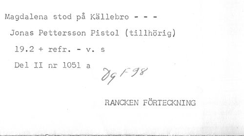 //// Magdalena stod på Källebro - - - //// Jonas Pettersson Pistol (tillhörig) //// 19.2 + refr* - v. s //// Del II nr 1051 a ^ //// RANCKEN FÖRTECKNING ////
