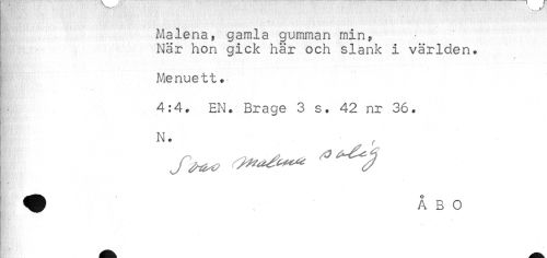 //// ! Malena, gamla gumman min, //// När hon gick här och slank i världen. //// ! Menuett. //// 4:4. EN. Brage 3 s. 42 nr 36. //// N. , //// - //// * //// „ ////
