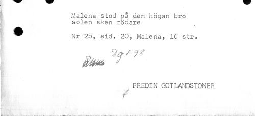 //// Malena stod på den högan bro //// solen sken rödare //// j ^ Nr 25, sid, 20, Malena, 16 str. //// i //// FREDIN GOILANDSIONER //// : //// /r //// ... .. -.. - . - ___ - .. . . . . - . . . . ////