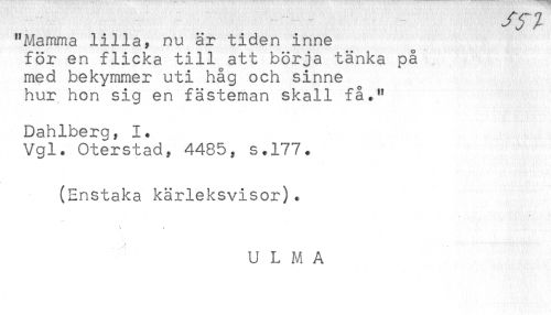 //// "Mamma lilla, nu är tiden inne //// för en flicka till att börja tänka på //// med bekymmer uti håg och sinne //// hur hon sig en fästeman skall få." //// Dahlberg, 1. //// Vgl. Oterstad, 4485, s.177. //// (Enstaka kärleksvisor)* //// . //// \ * ////