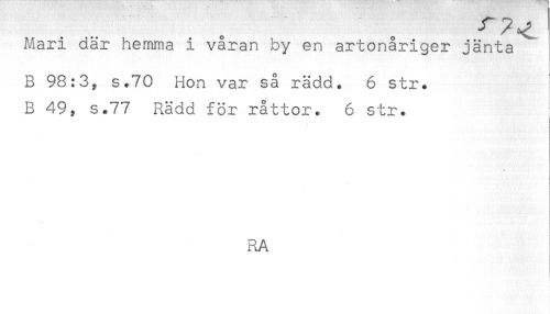 //// ? ^ //// Mari där hemma i våran by en artonåriger jänta //// B 98:3, s.70 Hon var så rädd. 6 str. //// B 49, s.77 Rädd för råttor. 6 str. ! //// i //// ! //// - ////