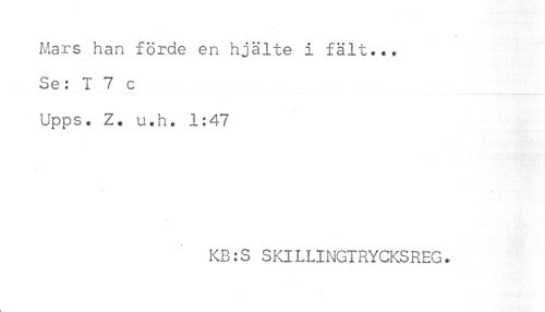 //// Mars han förde en hjälte i fält... //// Se: I 7 c //// Upps* Z. u.h. 1:47 //// KB:S SKILLINGTRYCKSREG * ////