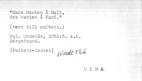 //// "Mars Monken å Mali^ //// dra vanten å Kari." //// (text till polkett.) //// * //// Vgl. Undenäs, 2251:5. s.6. //// Bergstrand. //// (Polkett-texter) ^^^^^ //// r //// ! //// ULMA //// i //// ! //// ' t ////
