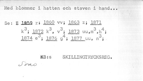 //// Med blommor i hatten och staven i hand... //// Se: E IBM r; 1860 vv; 1863 z; 1871 //// k^; 1872 k^, v^; 1873 //// 1874 e^'; 1876 g^; 1877 uu, n^; //// KB:s SKILLINGTRYCKSREG. ////