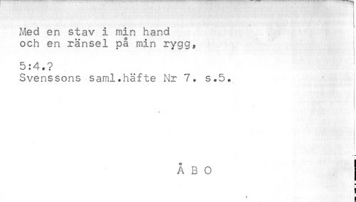 //// Med en stav i min hand //// och en ränsel på min rygg, //// 5:4.? //// Svenssons saml.häfte Nr 7. s*5. I //// r //// f - ////