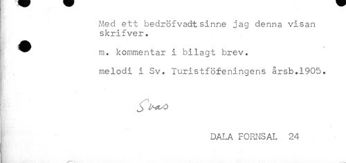 //// Med ett bedröfvadt sinne jag denna visan //// skrifver. //// ^^ m* kommentar i bi lagt brev. //// melodi i Sv. Turistföfeningens årsb.1905. //// < //// DALA FORNSAL 24 ////