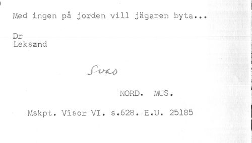 //// Med ingen på jorden vill jägaren byta... //// Dr //// Leksand //// L //// a //// NORD. MUS. //// ! //// ) //// f //// Mskpt. Visor VI. s.628. E.U. 25185 //// F ////