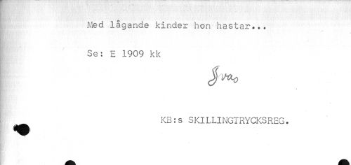 //// - - //// L Med lågande kinder hon hastar... //// Se: E 1909 kk //// * //// KB:s SKILLINGTRYCKSREG. ////