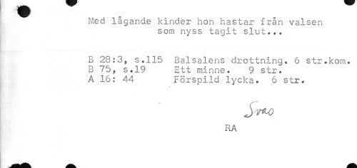 //// Med lågande kinder hon hastar från valsen //// som nyss tagit slut... //// B 28:3, s.115 Balsalens drottning. 6 str.kom. //// B 75, s.19 Ett minne. 9 str. //// A 16: 44 Förspild lycka. 6 str. //// * //// RA ////