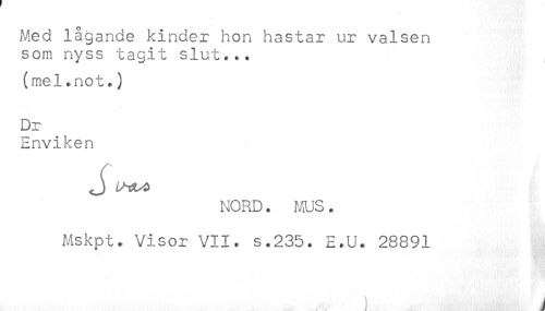 //// Med lågande kinder hon hastar ur valsen //// som nyss tagit slut... //// (mel.not.) //// Dr //// Enviken //// NORD. MUS. //// Mskpt. Visor VII. s.235. E.U. 28891 //// ) ) ////