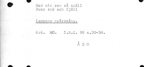 //// ^^ Med min ren så snäll //// över snö och fjäll //// Lappens nyårssång. //// 6:6. HO. I.N.E. 98 s.33-34, //// * //// ÅBO ////