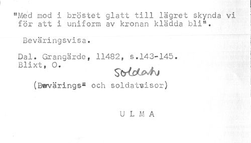 //// "Med mod i bröstet glatt till lägret skynda vi //// för att i uniform av kronan klädda bli". //// - //// Beväringsvisa. ; //// < //// Dal. Grangärde, 11482, s.143-145. //// Blixt, O. ; ^ //// (Bwvärings^ och soldat^isor) //// ! //// U L A ////