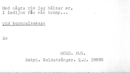 //// Med några rim jag hälsar er, //// I ledljus får vår tropp... //// Vid korpralssexan //// Bo //// * //// NORD. MUS. //// Mskpt. Soldatsånger. E.U. 29895 ////