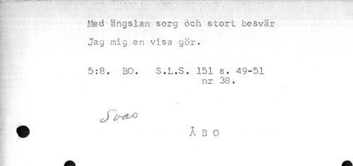 //// - ' . . - . ' . //// Med ängslan sorg och stort besvär //// : //// - //// Jag mig en visa gor. //// . //// . //// 5:8. BO. S.L.S. 151 s. 49-51 //// nr 38. //// * ////