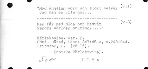 //// "Med ängslan sorg och stort besvär //// Jag mig en visa gör... //// Man får med möda och besvär (v.3) //// - //// Vandra världen omkring....." //// * //// Kärleksvisa. Var. B. //// Sdml. Härad, Länna 347:45 a, s.243-244. //// Ericsson, G. (bd 16). //// Enstaka kärleksvisa). //// ULMA ////