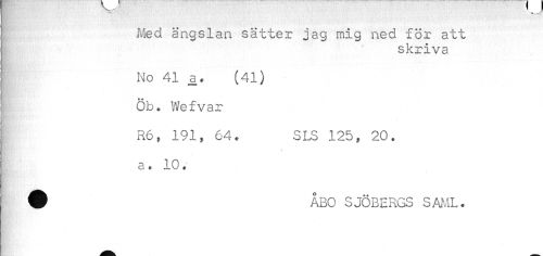 //// Med ängslan sätter jag mig ned för att //// skriva //// No 41 a. (41) //// I Öb. Wefvar //// R6, 191, 64. SLS 125, 20. //// a. 10. //// # ÅBO SJÖBERGS SAML. ////