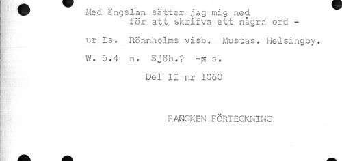 //// ^^ Med ängslan sätter jag mig ned //// för att skrifva ett några ord - //// ur Is. Rönnholms visb. Mustas, Helsingby. //// ! VJ. 5.4 n. Sjöb.? -p s. //// ' Del II nr 1060 //// RASCKEN FÖRTECKNING ////