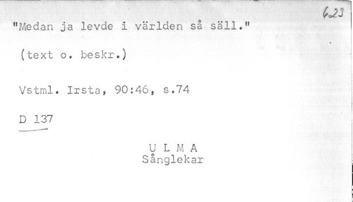//// "Medan ja levde i världen så säll<" //// ... t ; ) //// (text o. beskr*) //// - . . . ,t; //// t //// t //// i //// i //// : //// Vstml. Irsta, 90:46, s.74 //// i //// D 137 //// U L M A //// Sånglekar t ////