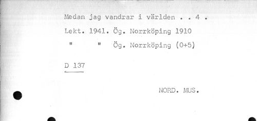 //// Medan jag vandrar i världen . . 4 . //// ^ Lekt. 1941. Ög. Norrköping 1910 //// " " Ög. Norrköping (0+5) //// D 137 //// *< //// ^ NORD. MUS. ////