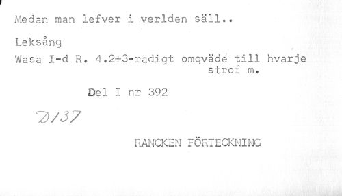 //// Medan man lefver i verlden säll.. //// Leksång //// Wasa I-d R. 4.2+3-radigt omqväde till hvarje //// strof m* //// Del I nr 392 //// RANCKEN FÖRTECKNING ////
