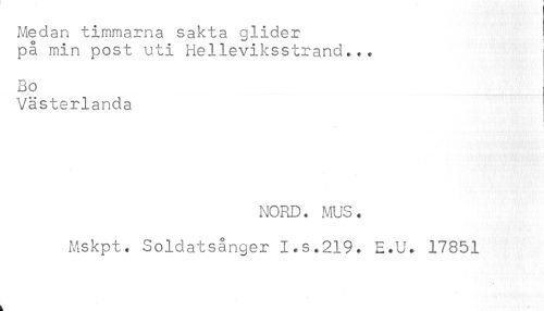 //// Medan timmarna sakta glider //// på min post uti Helleviksstrand*.* //// Bo //// Västerlanda //// NORD. MUS. //// Mskpt. Soldatsånger I.s.219. E.U. 17851 //// k ////