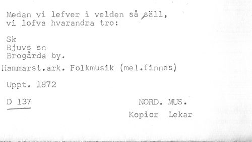 //// Medan vi lefver i velden så .säll, //// vi lofva hvarandra tro: //// Sk //// Bjuvs sn //// Brogårda by. //// Hammarst.ark. Folkmusik (mel.finnes) //// Uppt. 1872 //// D 137 NORD. MUS. //// Kopior Lekar //// ^ . ... . . . ... - __.... . -___-r---. . - -- *.-.---W-^-----r. , ---- -. ,-r ^---i , ---------------'------- -.- - - ////