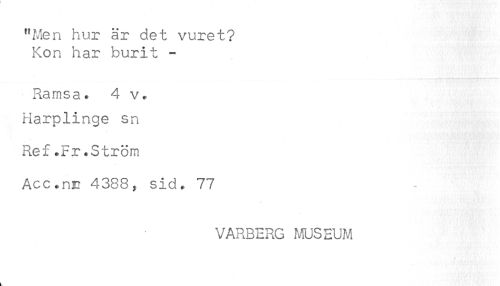 //// "Men hur är det vuret? //// Kon har burit - //// Ramsa. 4 v. //// Harplinge sn //// Ref.Fr.Ström //// Acc.nE 4388, sid, 77 //// VARBERG MUSEUM ////