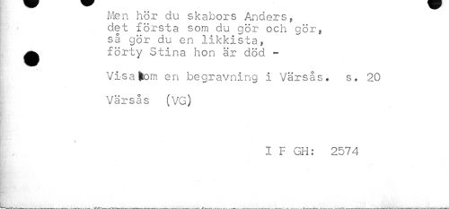 //// Men hör du skabors Anders, //// det första som du gör och gör, //// så gör du en likkista, //// ^ förty Stina hon är död - //// Visa^om en begravning i Värsås. s. 20 //// , //// Värsås (VG) //// I F GH: 2574 //// HnW''* ////