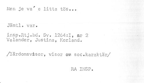 //// Men je va^ e litta tös... //// Jämtl. var. //// insp.Rtj.bd. Sv. 1264:1, ar 2 //// Veländer, Justina, Korland. //// /lärdomsvisor, visor om soc.karaktär //// /RA INSP. ////
