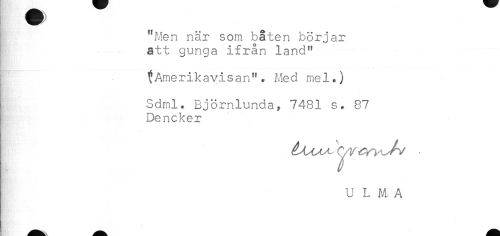 //// ! "Men när som båten börjar //// att gunga ifrån land" //// fAmerikavisan". Med mel.) //// Sdml. Björnlunda, 7481 s. 87 //// Dencker //// * //// U L M A ////