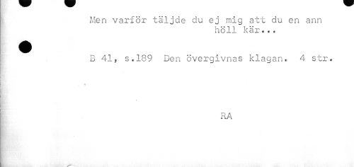 //// Men varför täljde du ej mig att du en ann //// höll kär... //// I B 41, s.189 Den övergivnas klagan. 4 str. //// ! //// H < //// RA ////