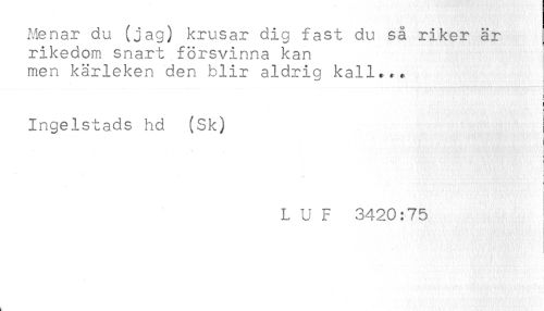 //// Menar du (jag) krusar dig fast du så riker är //// rikedom snart försvinna kan //// men kärleken den blir aldrig kall... //// ! //// Ingelstads hd (Sk) //// ! //// t //// ' //// L U F 3420:75 //// k ////