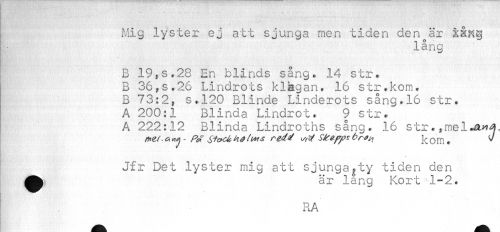 //// • • • . //// Mig lyster ej att sjunga men tiden denQär iå^g //// lång //// ; B 19,s.28 En blinds sång. 14 str. //// B 36fs.26 Lindrots klkgan. 16 str.kom. B 73:2, s.120 Blinde Linderots sång.16 str. A 200:1 Blinda Lindrot. 9 str. A 222:12 Blinda Lindroths sång. 16 str.,mel //// ve/.a- P<?r $fodck#(ms r^edåt ^ Skeppsbr*^ jcom# //// Jfr Det lyster mig att sjunga * ty tiden den //// är lang Kort 1-2. //// I RA //// Ét ////