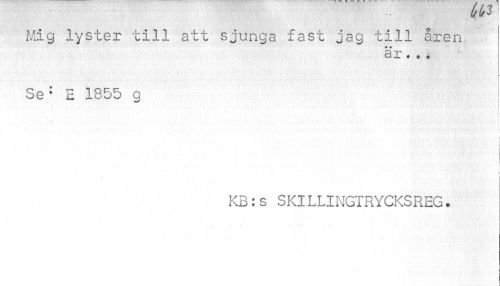 //// Mig lyster till att sjunga fast jag till åren //// är. .« //// Se; E 1855 g //// I //// f ; //// i //// i //// //// /I //// KB:s SKILLINGTRYCKSREG. //// i //// . " J _ I ////