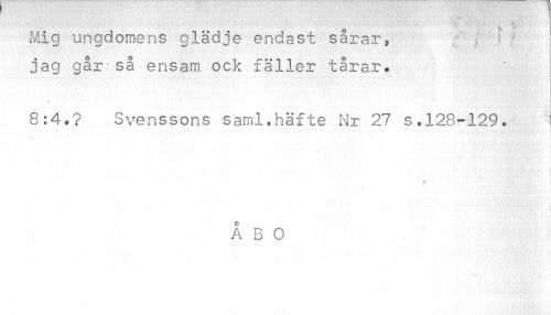 //// Mig ungdomens glädje endast sårar, jag går-så ensam ock fäller tårar. //// i //// 8:4.? Svenssons saml.häfte Nr 27 s.128-129. I //// v //// - //// J //// » i //// i //// Å B O ////