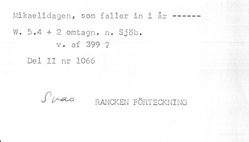 //// i //// Mikaelidagen, som faller in i år ---- //// W. 5.4 + 2 omtagn. n. Sjöb. //// v• af 399 ? //// Del II nr 1066 //// f lA^oo RANCKEN förteckning //// k ////