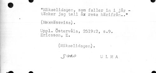 //// "Mikaelidagen, som faller in i jår -tänker jag tell åx resa härifrån.." //// i //// (Mexmässvisa) * //// Uppl. Östervåla, 2519:2, s.9. Ericsson» E. //// (Mikaelidagen)* J^slHtsP U L M A //// 'ii&bft ri ¦ . . ? ////