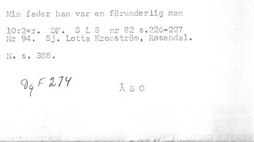 //// Min fader han var en förunderlig man //// i //// 10:2+r. DF. SLS nr 82 s.226-227 Nr 94, Sj, Lotta Kronström* Rosendal. //// N. s. 388. //// * bo ////