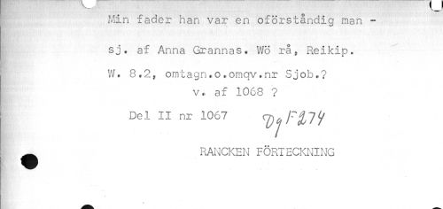//// Kin fader han var en oförståndig man - //// sj. af Anna Grannas» Wö rå, Reikip. //// t W. 8.2, omtagn.o.omqv.nr Sjob.? //// v. af 1068 ? //// Del II nr 1067 ^cjFH^ ^ RANCKEN FÖRTECKNING ////