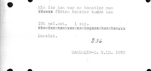 //// w Min far han var .en konstier man //// fäxMt® fämton konster kudde han //// i 106 mel»not. 1 str. //// Danslek. //// CARLHEIM-G. S.LM. 1892 //// r ' v ** ////
