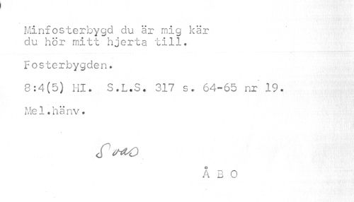 //// Minfosterbygd du är mig kär du hör mitt hjerta till. //// Fosterbygden. //// 8:4(5) Hl. S.L.S. 317 s. 64-65 nr 19. //// Me1.hänv. //// ÅBO //// j> ////