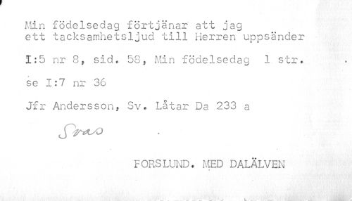 //// Min födelsedag förtjänar att jag //// ett tacksamhetsljud till Herren uppsänder //// 1:5 nr 8, sid.. 58, Min födelsedag 1 str.. * //// se 1:7 nr 36 //// Jfr Andersson, Sv. Låtar Da 233 a //// «. « //// FORSLUND, MED DALÄLVEN //// * * //// ..l ////